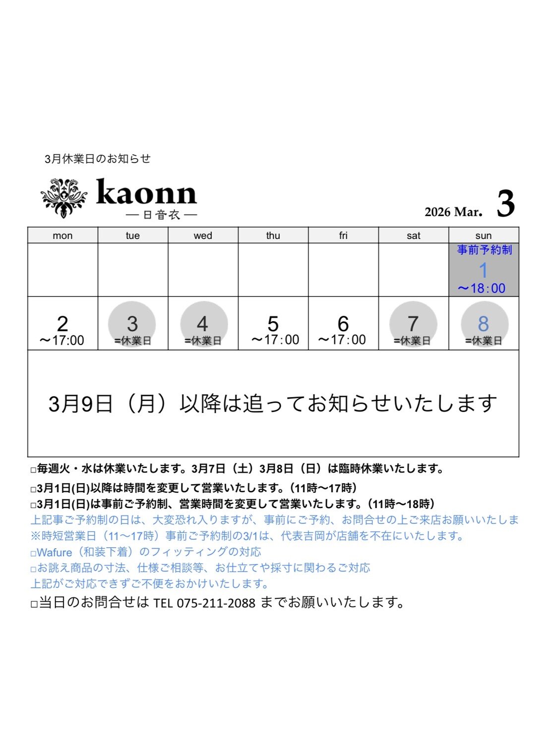 kaonn -日音衣- 店内改装に伴う休業・夏季休業のお知らせ